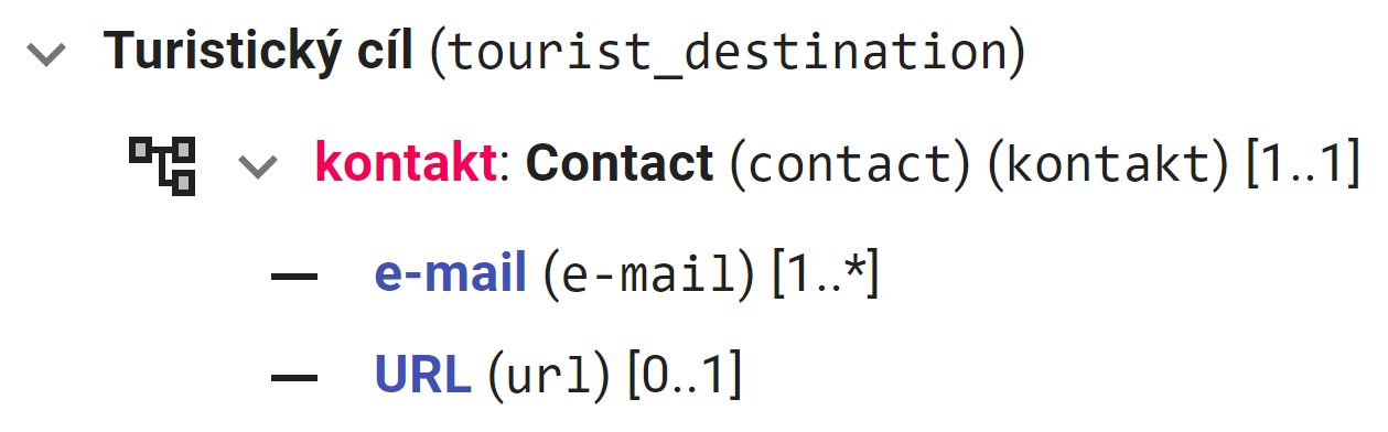 - DISALLOWED - The shape prohibits any extra attributes to be tied to the class other than those explicitly stated in the data specification. For our example data specification that would mean, that if we wanted the “Turistický cíl” or “Kontakt” class to have any other attribute than “má URL” in the data, the Shape would validate data containing extra attributes as INVALID.